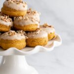 Now, carefully dip the donuts about halfway up in the glaze. Once they are glazed, sprinkle with the chopped pecans. You can also add granola, chopped pepitas, chopped walnuts, or even chopped pistachios. There are a lot of great options!